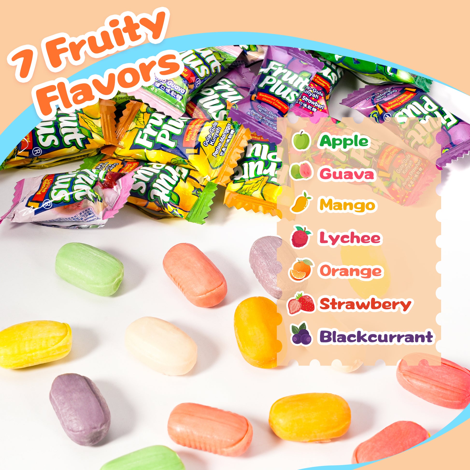 Multiple Flavors to Choose From: There are 7 kinds of flavors to choose from: strawberry, guava, lychee, mango, orange, blackcurrant, and apple. Each fruity candy offers a true-to-fruit taste, from zesty citrus to sweet berries, good choice for anyone who loves chewy candy with real fruit flavor